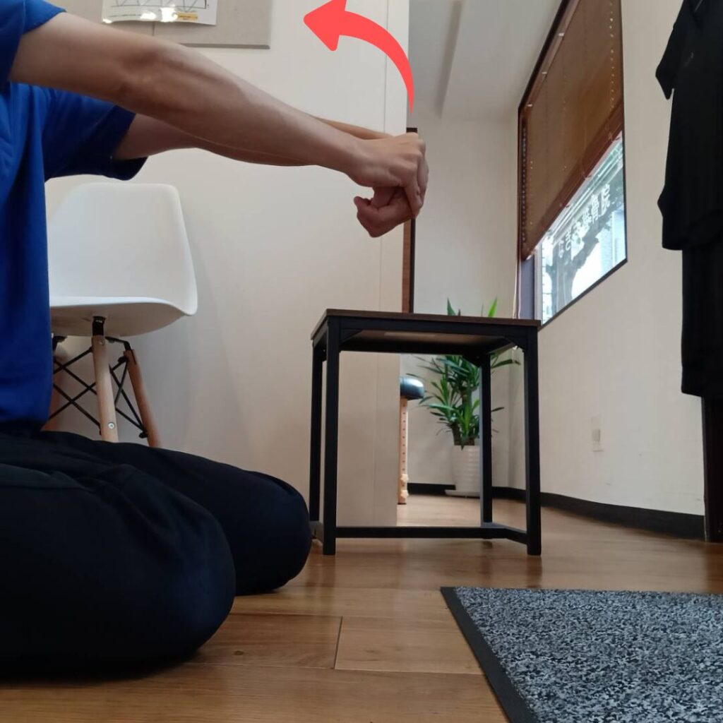 ⭐チェアリフトテスト 肘をまっすぐ伸ばし、手のひらを下向きにして椅子を持ち上げようとします。この時、肘の外側に痛みが出れば、テニス肘の可能性が高いです。