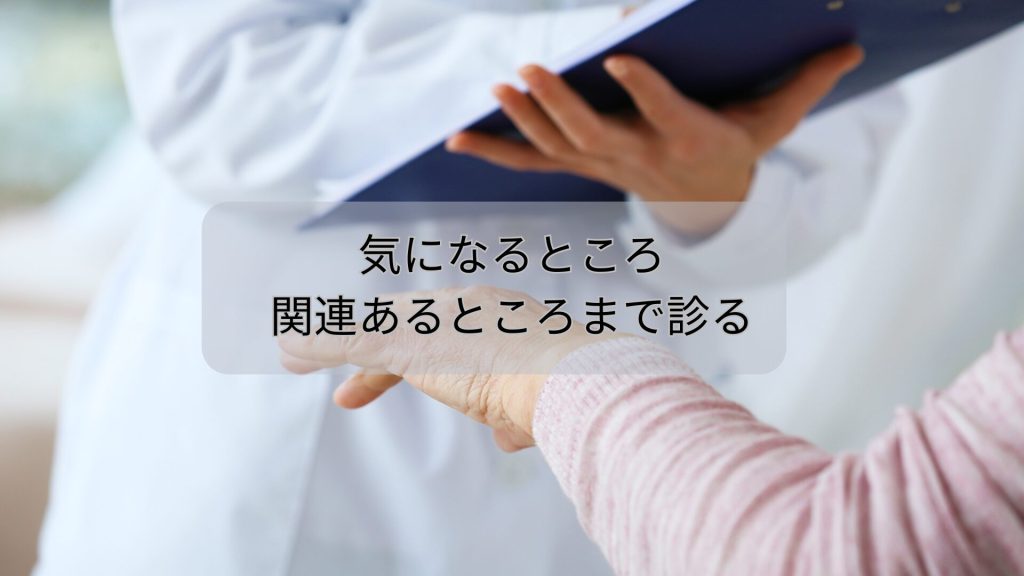 現在のお悩み、症状、これまでの経緯などお伺いしています。患者さんによって悩みは違ってきますので一人ひとり丁寧なカウンセリングを心がけています。患者さんが求めている改善と患者さんの状態をしっかりとすり合わせしてどのくらいの期間で目標が達成できるか、回数、ご来院の頻度もお伝えしています。専門用語をなるべく使わずわかりやすい説明を意識していますので安心していただくことができます。