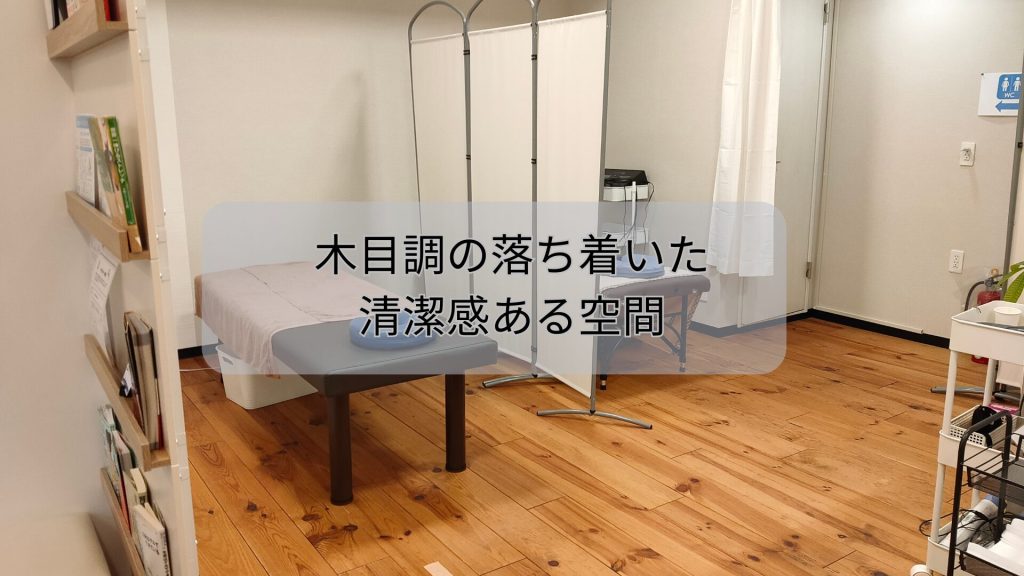 床が木目調で白をベースとしており清潔感ある落ち着いた空間で施術を安心して受けることができます。また当院では女性スタッフも毎日ではないですが、日程によって在中しており、安心していただけます。